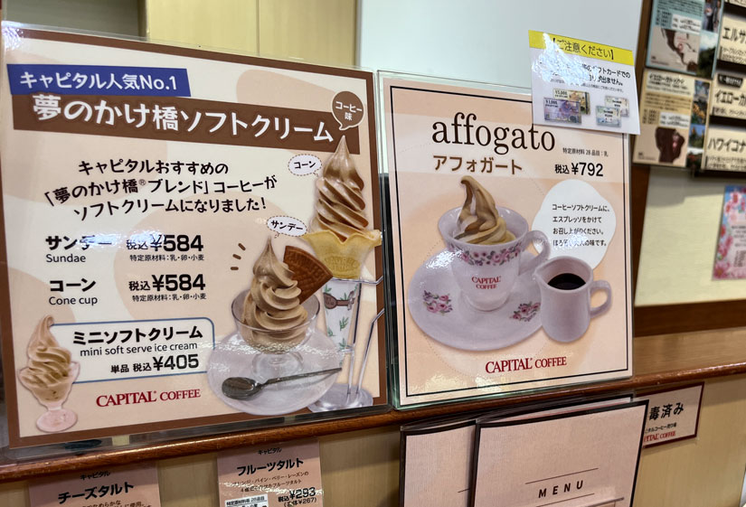 商品名にもなってる珈琲豆を使った「夢のかけ橋®ソフトクリーム」は、サンデー・コーン各584円、「ミニソフトクリーム」405円。「アフォガード」(792円)も選べます。