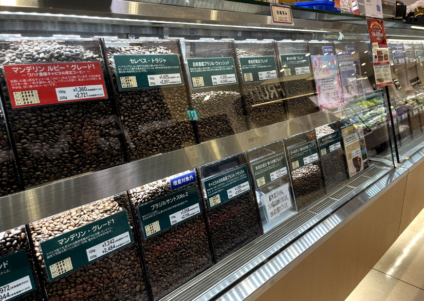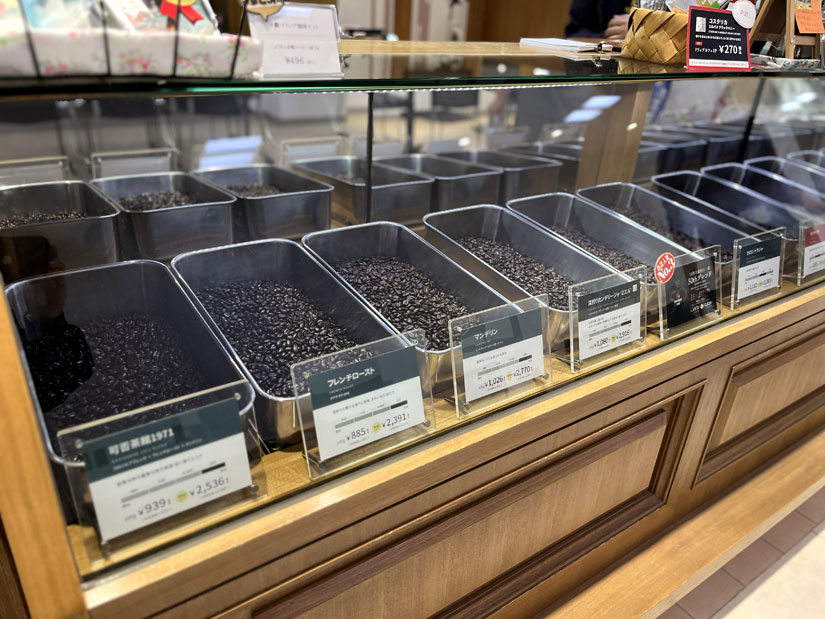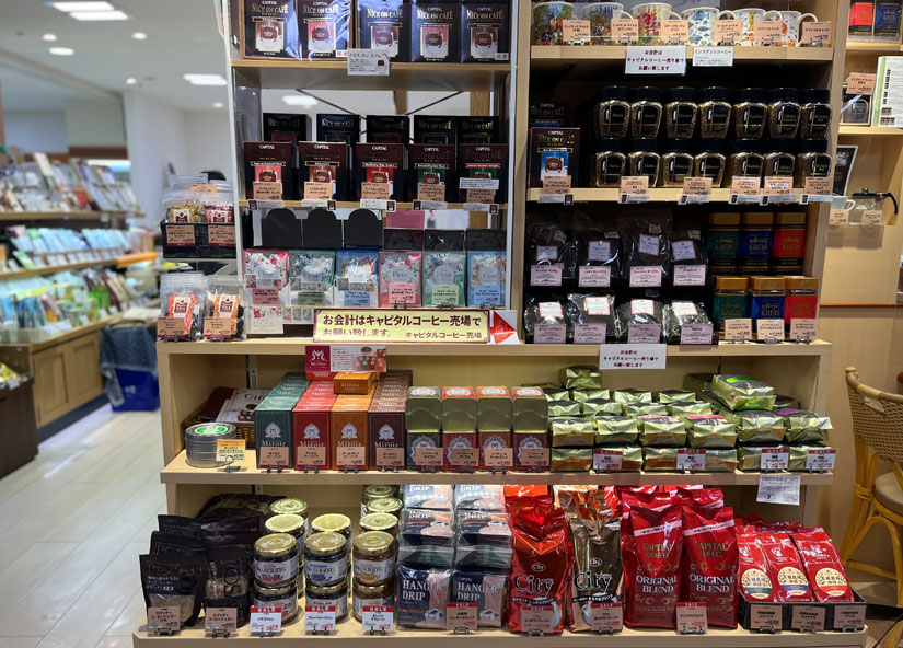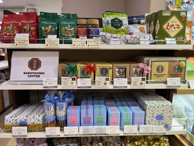 近くには、「猿田彦珈琲」のドリップや「イノダコーヒー」の豆、「ウェッジウッド」のティーなども並びます。