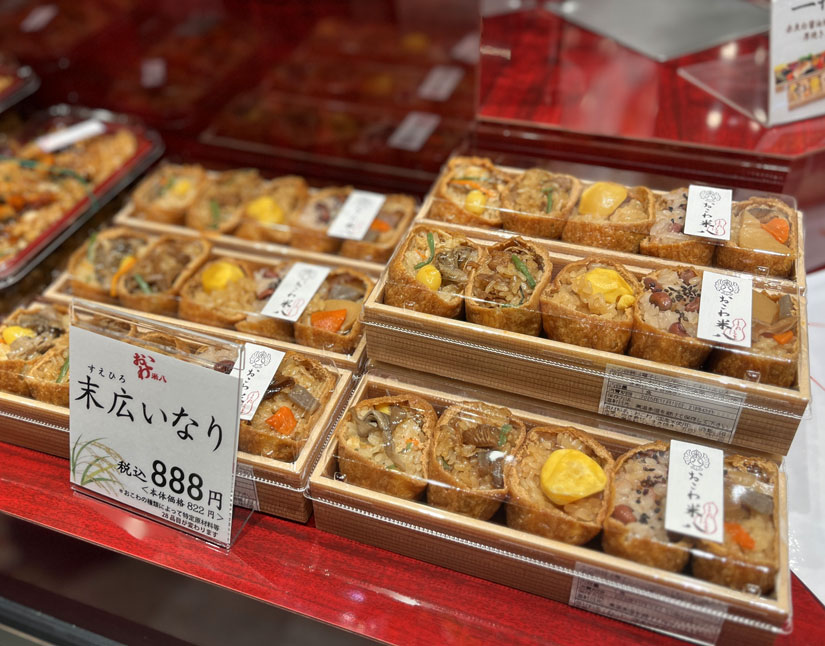隣接の厨房で炊き上げる「五目おこわ」や「お赤飯」、季節のおこわとお弁当を販売。