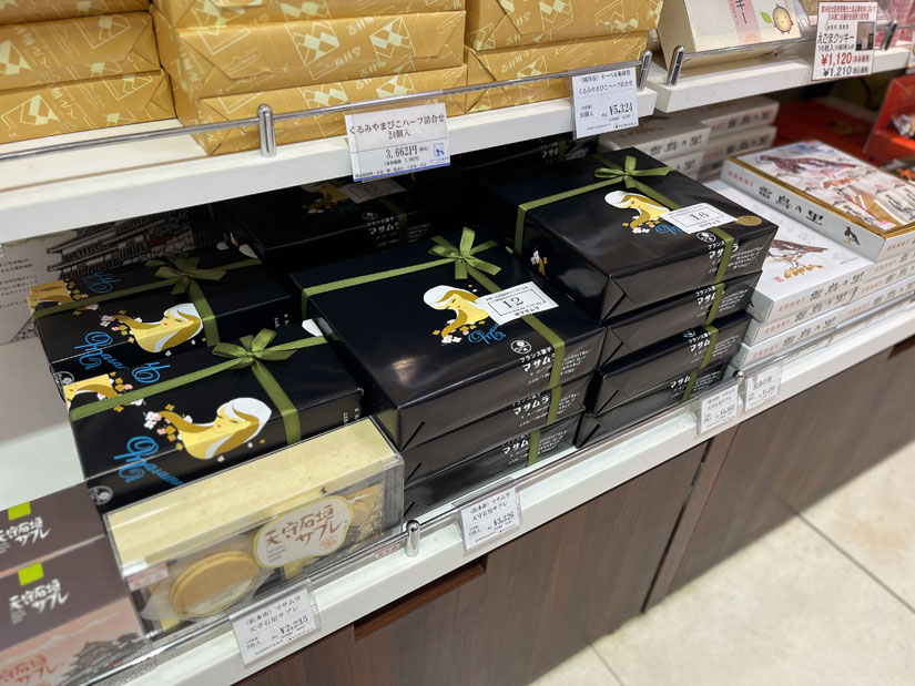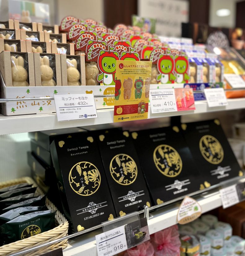 小布施町「風味堂」のもなかや、松本市「マサムラ」、諏訪エリアに店舗展開する「ヌーベル梅林堂」、「軽井沢チョコレートファクトリー」など、様々なお店のお菓子や食品が並んでおり、見ていると楽しくなります。