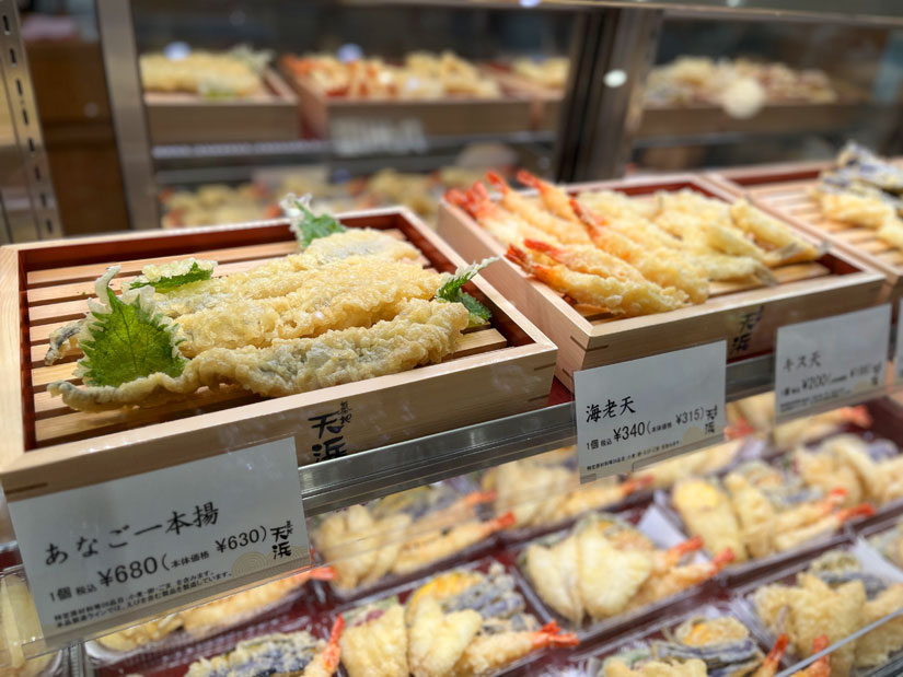 「あなご1本揚」(680円)、「海老天」(340円)をはじめ、「さつまいも天」「れんこん天」「なす天」(各100円)などを個別販売。夕食のお供におすすめです。
