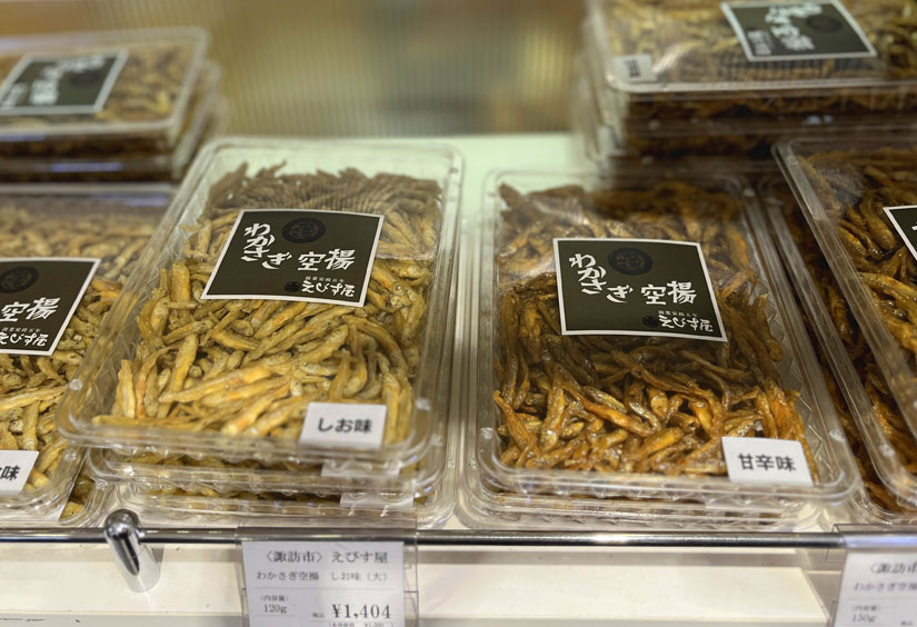 教えていただいた人気商品は、諏訪市「えびす屋」の「わかさぎ空揚」(しお味/甘辛味)。とくに塩が売れているのだとか。美味しそうです♪