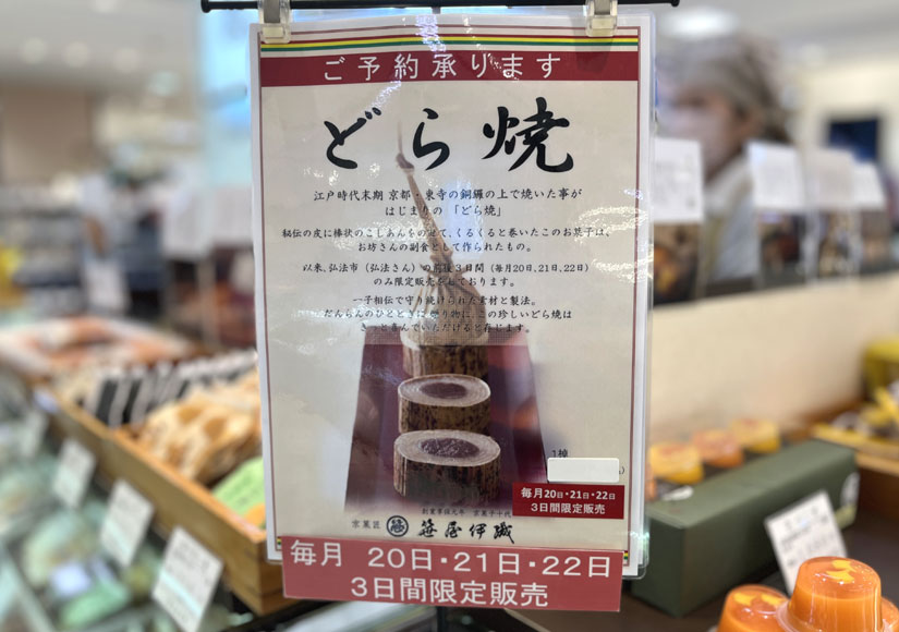 「笹屋伊織」は毎月20日・21日・22日のみ限定販売される同店の銘菓「どら焼」があります。