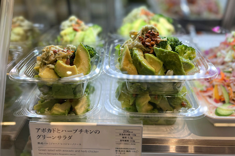 画像は、「RF1」の「ローストビーフと揚げごぼうのサラダ」と「アボカドとハーブチキンのグリーンサラダ」。