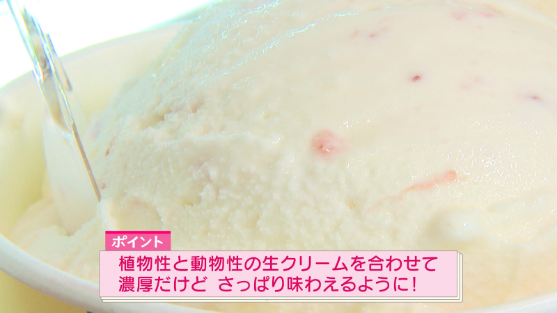 ミルク感がとっても強いのに、さっぱりとした舌触り。いちごもかなりたくさん入っているので、程よい酸味が後を引きます。植物性と動物性の生クリームを合わせることで、濃厚だけどさっぱり味わえるようにしているんだそうです。