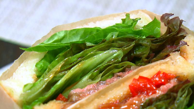 国産牛のサーロインを使ったローストビーフを、レタスやパプリカなど新鮮野菜と一緒に自家製パンで挟んだぜいたくな一品です。