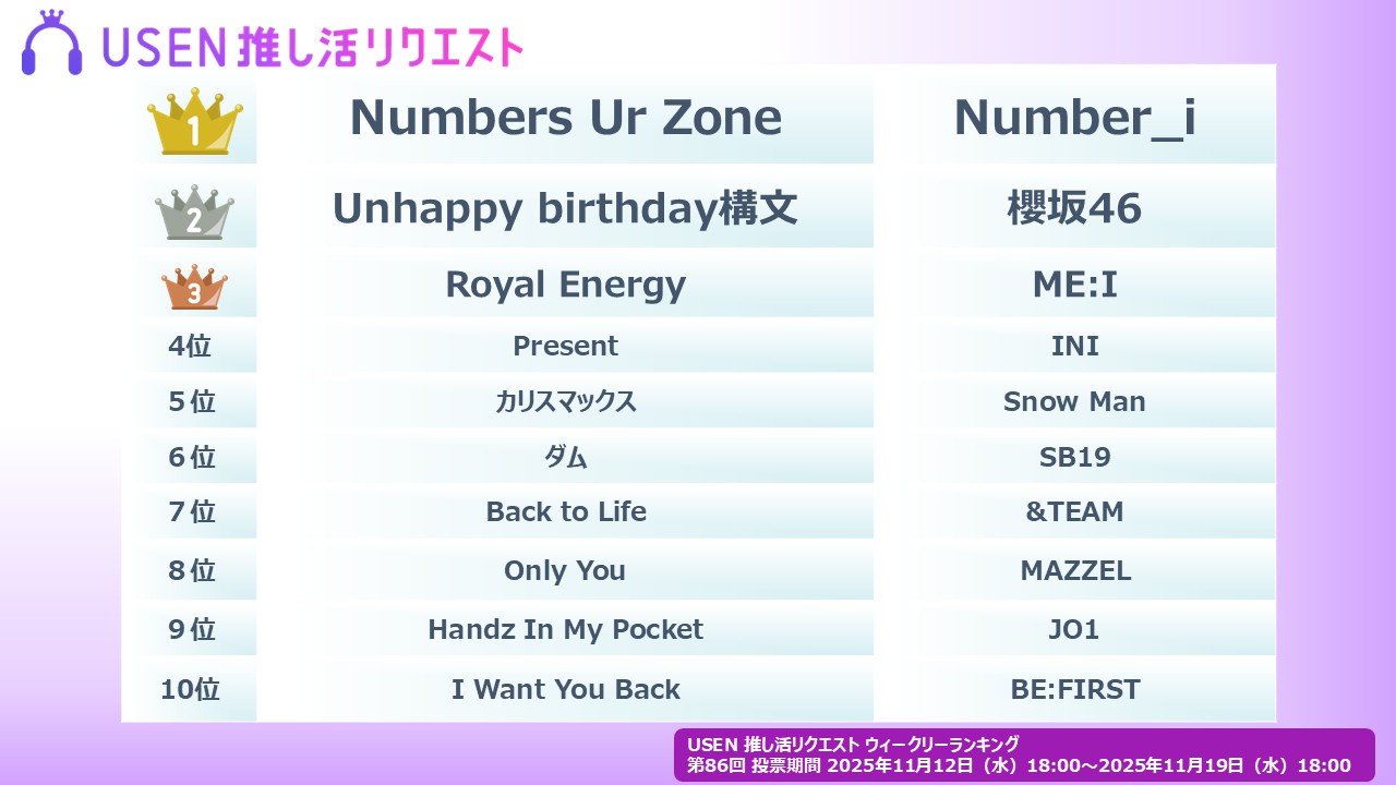 Number_iの「Numbers Ur Zone」が1位を獲得!USEN 推し活リクエスト(推しリク)第86回 「ウィークリーランキング」を発表!~ 上位ランクイン楽曲は街中・店内で配信!