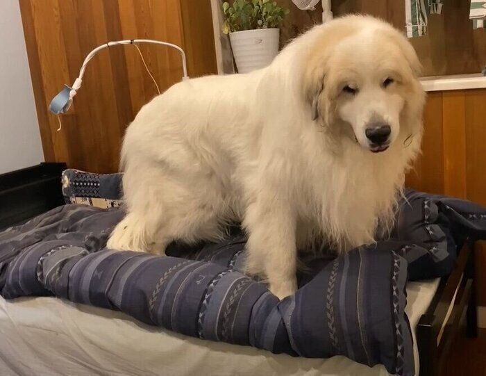 掲載協力/YouTube(更なる縄張りを求めお父さんのベッドを狙っているアランです Great Pyrenees グレートピレニーズ)