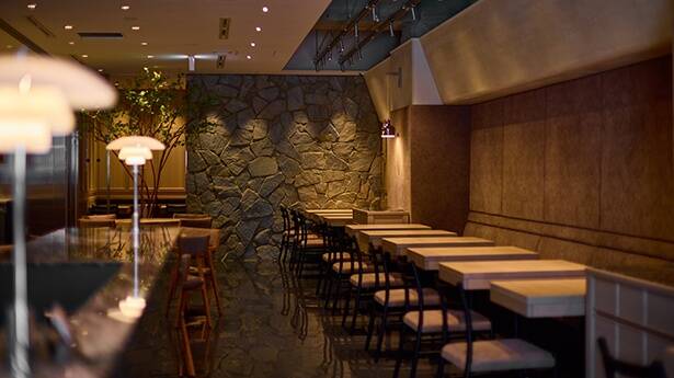 天井高を活かした開放的な空間に、シェフが料理を説明するU字カウンターを囲む8席。空間設計はスイスを拠点に活躍するデザインチーム「atelier oï(アトリエ・オイ)」が手掛けている。
