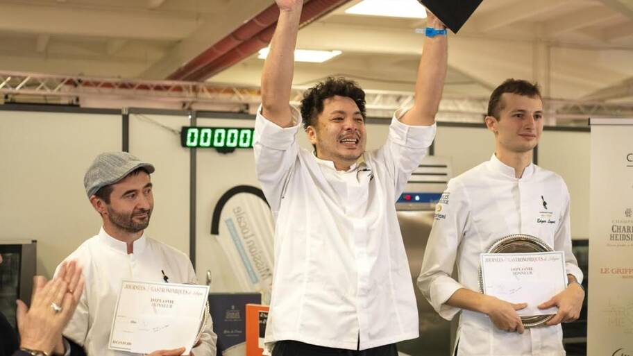 ラ・ロシェルで8年修業後、渡仏。モダンフランス料理で名を馳せていたリヨンの「ニコラ・ル・ベック」、「ラ・プラージュ」を経て、2007年からサン=ヴァランタン村の「Au 14 Février Saint-Valentin」でシェフを務める。2013年「Au 14 Février Saint-Amour-Bellevue(オーキャトーズフェヴリエ サンタムール・ベルヴュ)」にて独立、2014年に一ツ星、2018年に二ツ星を冠した。「星を獲ったことで僕自身は変わりませんが、周りの見る目がガラリと変わりました」。馴染みの生産者はよりよいものを融通してくれるようになり、食材の売り込みもひっきりなしになった。「じっとしていてもよい食材が集まる。星を獲るってこういうことかと実感しました」