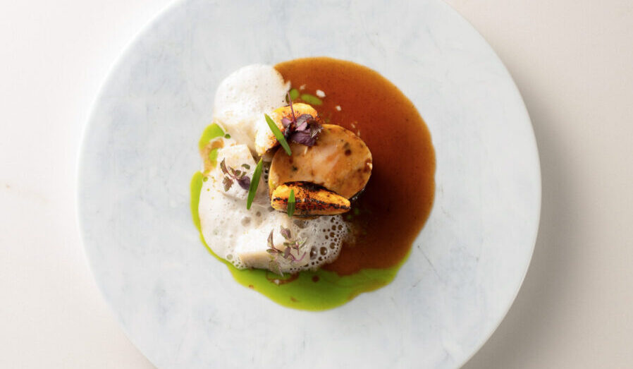 「Brise de mer カボス キャベツ/五島の海」五島・いでぐち鮮魚の神経締めされたマハタを、凍らないギリギリの温度帯で1週間熟成させてレアに火を入れ、ねっとり印象的な質感に。ワタリガニのアメリケーヌとマハタのだしを加えたブールブラン、2種類のソースで。合わせた大分産カボスはペーストとゼストでアクセントに。
