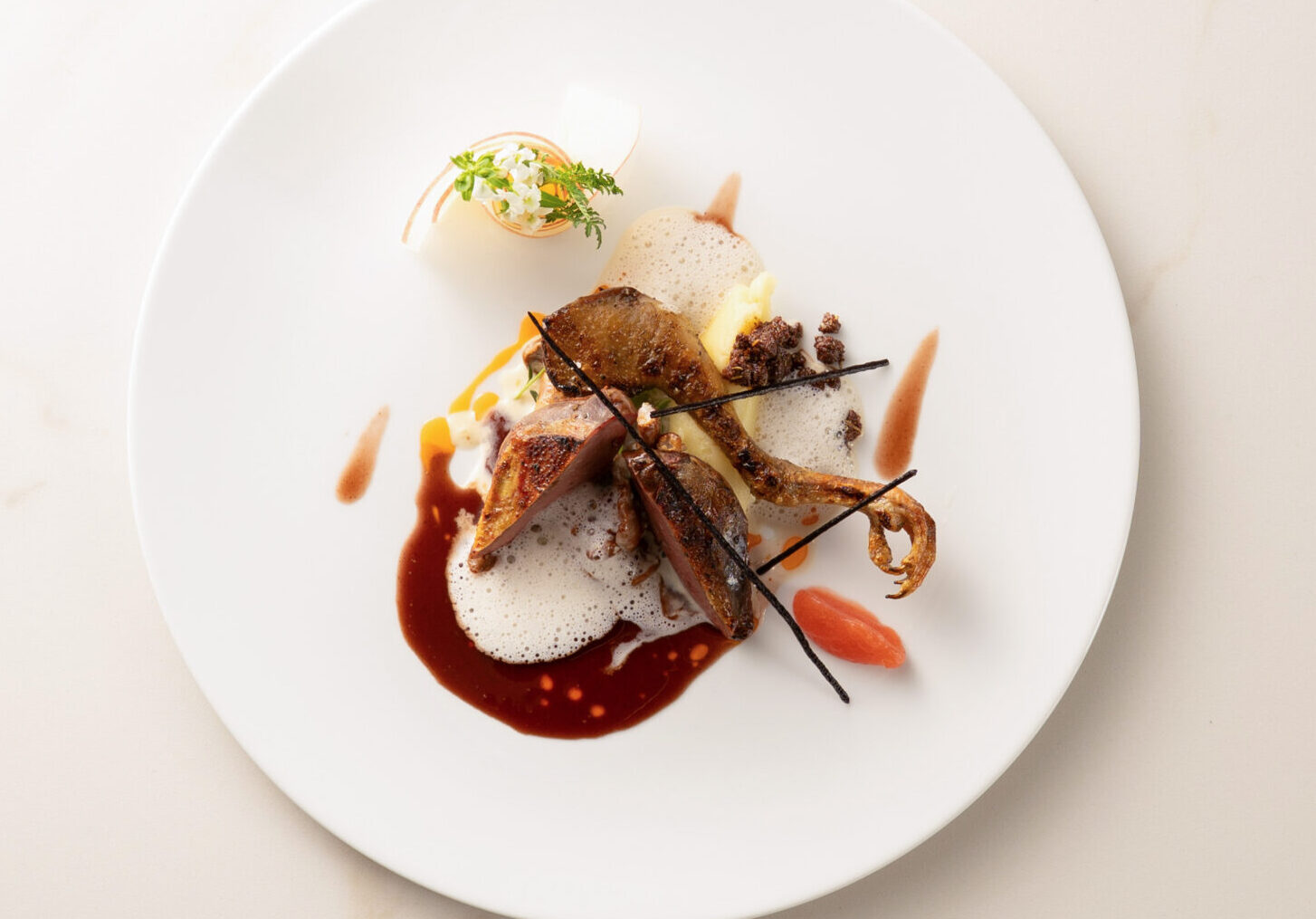 「Terroir 林檎 木の子/小鳩」仏産小鳩のモモ肉のローストとムネ肉のコンフィ。合わせるリンゴはスライスやピュレでソースやクランブルに忍ばせる。