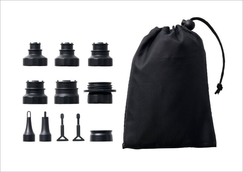 当商品には、エアマット用ノズルが8種類付属。幅広い製品にフィットするよう、国内外で販売されている300種類以上のエアマットを調査して作られました。送風時にバルブを手で押さえておく必要はなく、便利なハンズフリー設営を実現。8種類のノズルは区別がつきやすいようナンバリングされています。