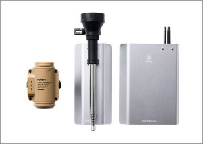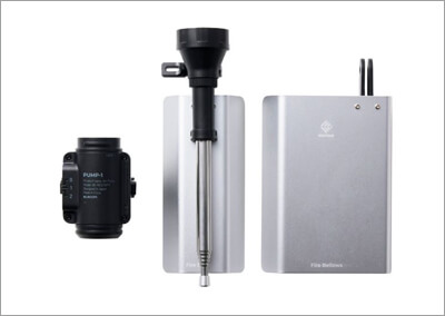 火起こしや火の調整に使えるファイアブロワーが付属しているタイプも同時発売。バッテリーと持ち手を熱にさらさず、安全に使えるヒートシールドを大小2種類付属しています。火種に的確に風を当てることができ、キャンプ道具として使う楽しさと実用性を兼ね備えた火吹き棒アタッチメントです。