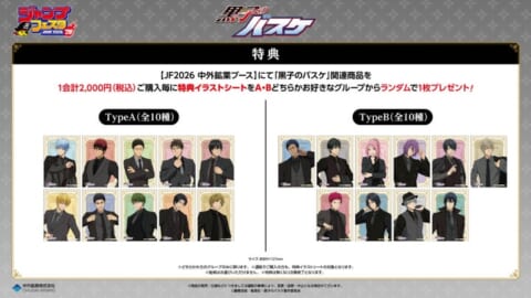 中外鉱業ブースにて『黒子のバスケ』JF2026関連商品を1会計2,000円(税込)ご購入毎に、特典イラストシートをA(全10種)・B(全10種)どちらかお好きなグループからランダムで1枚プレゼントされます。通販でご購入の方も特典プレゼントの対象です。