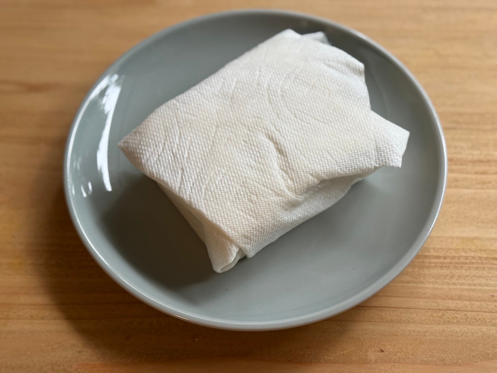 電子レンジで水切りする場合は、キッチンペーパーで包み、600Wで2分(500Wの場合は2分20秒)加熱する。