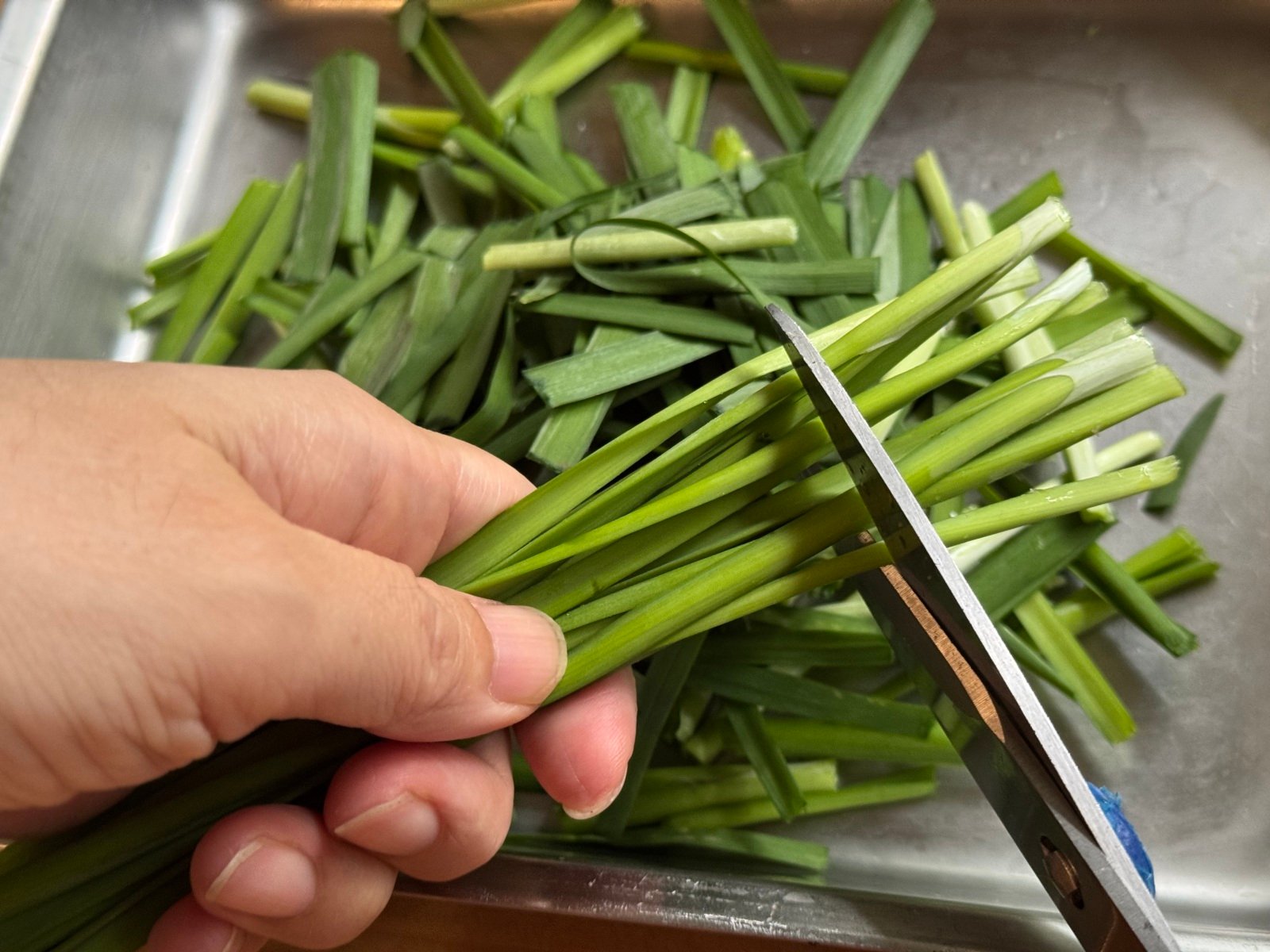 2.ニラは根元を切って、キッチンばさみで5cmほどにカットする。