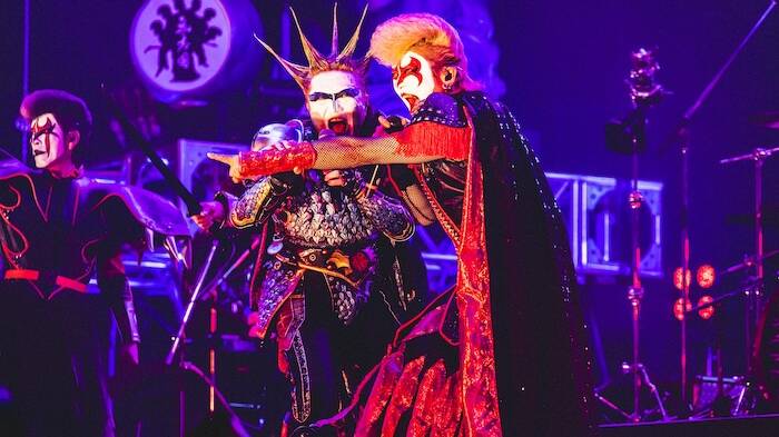 その後もゴールデンボンバーらしい自由奔放なステージが続いた。『抱きしめてシュヴァルツ』では、鬼龍院の「PAさん次の曲、再生してください!」の声とともに楽曲が始まり、いつの間にかステージから消えていた喜矢武が巨大ほりにしを抱えて登場し、海宝丼を豪快に食べるパフォーマンスを披露。続いて樽美酒が巨大バイブを模したバイクになって、ふんどし姿で手を振りながら会場を爆走するというカオスぶりで客席を沸かせた。