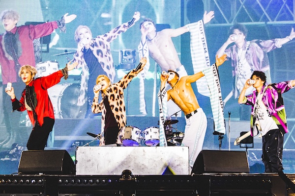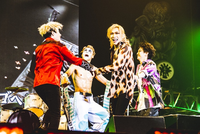 「合法的に全裸になるには!?」という刺激的な一文からライブが幕を開けたゴールデンボンバー。小便小僧などの裸アートを「アートだからね!」と紹介しつつ、DJ OZMAまで巻き込み「最初で最後のアート活動」「後世に残したい」と謎めいた言葉を投げかける破茶滅茶なアタック映像にオーディエンスは早くも爆笑。続く定番の「ゴールデンボンバー始まるよ!」のコールで『元カレ殺ス』が流れ、金髪ロングをポニーテールにした鬼龍院翔(Vo-karu)、喜矢武豊(Gita-)、歌広場淳(Be-su)、樽美酒研二(Doramu)が勢いよく登場した。