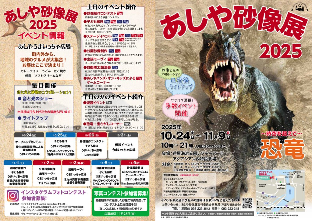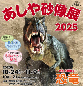 2025年10月24日(金)~11月9日(日)の17日間にわたり開催される**『あしや砂像展2025 ~時空を超えて~ 恐竜』**は、記念すべき10周年。
