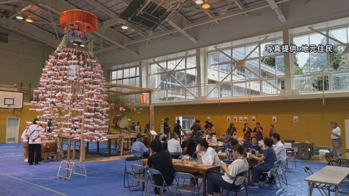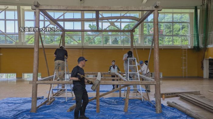 そして大工を中心に5時間かけて組み立てました。場所は当初、神社の境内を予定していましたが、段差が多かったため、神社近くの旧長沢小学校の体育館にしました。