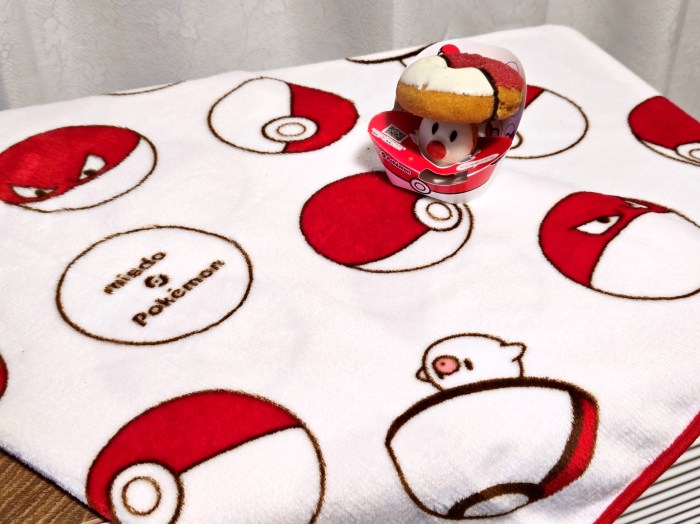 今年の「グッズセット(テイクアウト:2100円)」は、ポケモンドーナツ2つ、ポン・デ・リース1つ、そして選べるブランケットが1枚ついてくるという内容。内容は昨年とほぼ変わらずだが、値段は100円ほど値上がっているみたい。