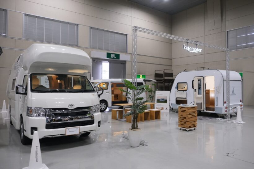 中にはキャンピングカーの展示も(写真は加藤モーターのブース)