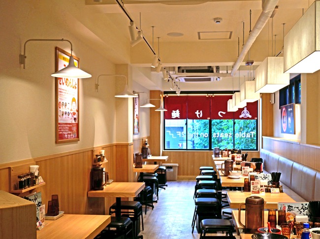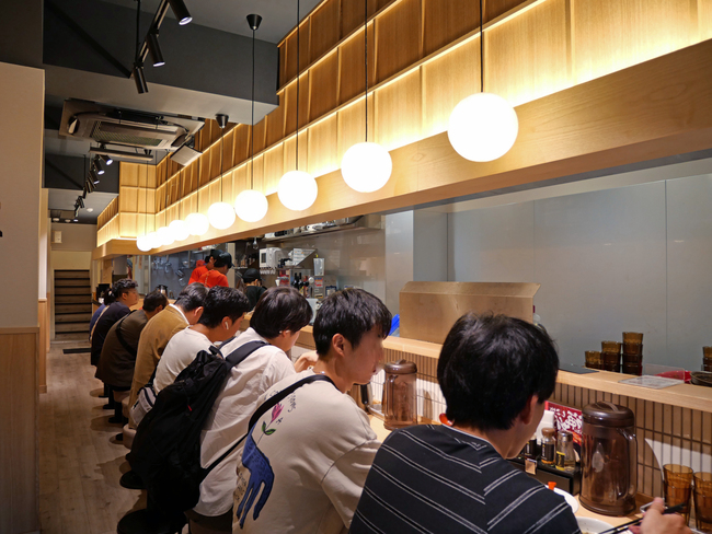 店内に入ると、まず目に飛び込むのは木目調で統一された明るく清潔感のある空間です。1階には、調理の様子を間近で楽しめるカウンター席がずらりと並び、活気に満ちています。