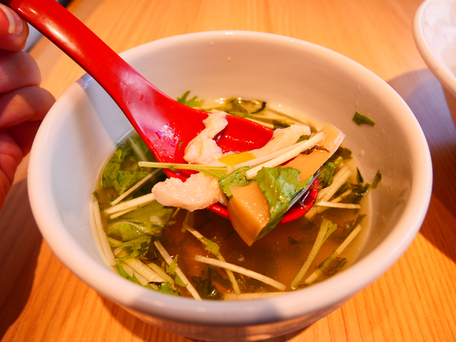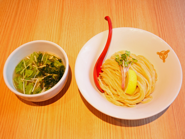 透明感のある鯛だしスープには、鶏肉やメンマがごろっと入り、水菜がアクセントになっています。麺をくぐらせると程よく旨味が絡み、つるっとさっぱりとした味わいに。付け合わせのレモンを麺に絞れば、さらに爽やかな香りが加わり、夏らしい清涼感を楽しめます。