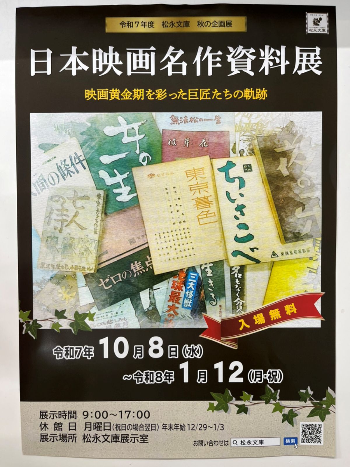 JR門司港駅から徒歩5分ほど旧大連航路上屋1階にある「松永文庫」展示室では現在、「日本映画名作資料展 映画黄金期を彩った巨匠たちの軌跡」が開催されています。期間は来年1月12日まで。