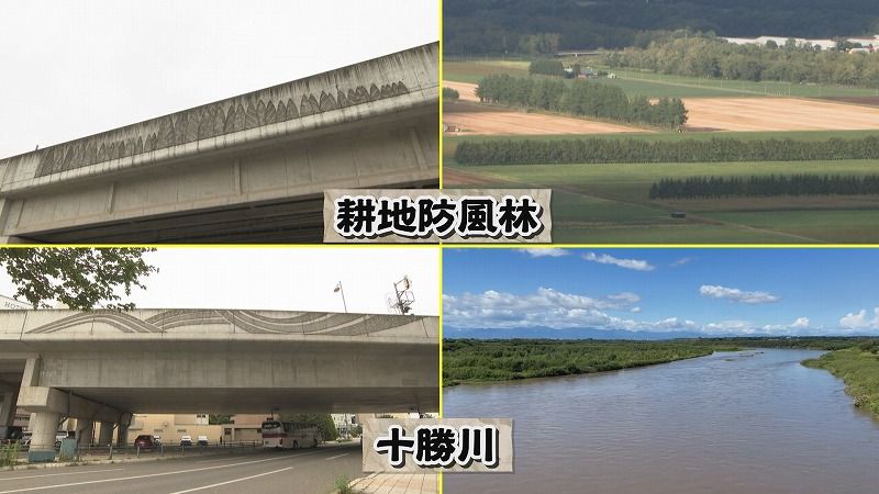 その他にも…高架の防音壁には、十勝川や耕地防風林などのデザインが施されているんだ!