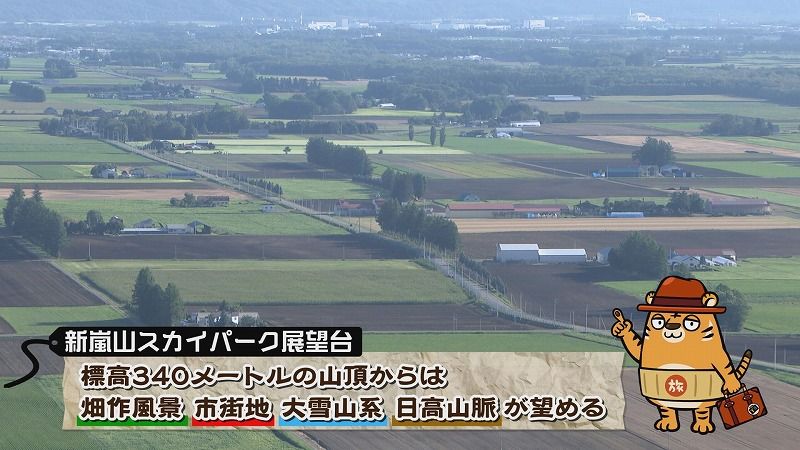 標高340メートルの山頂からは、全道1位の耕地面積を誇る畑作風景はもちろん、奥には芽室町、右側は帯広市の街並みさらに、奥には大雪山系・左を向くと日高山脈までが見れるんだ~。