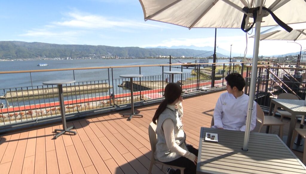 階段を上がるとテラス席。目の前に広がる諏訪湖、奥にそびえる八ヶ岳連峰が一望できます!