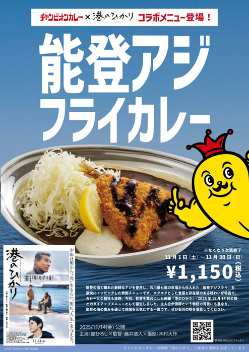 【金沢カレー】映画『港のひかり』とタイアップ!チャンピオンカレーから「能登アジフライカレー」が11/1(土)より期間限定販売!チケットが抽選で当たるXキャンペーンも♪