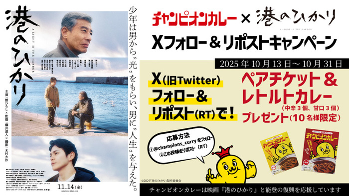 X公式アカウント「チャンピオンカレー」(https://x.com/champions_curry( https://x.com/champions_curry ))をフォローし、該当ポストをリポスト(RT)すると、抽選で10名様に映画『港のひかり』ペアチケット&レトルトカレー(中辛3個、甘口3個)が当たります。