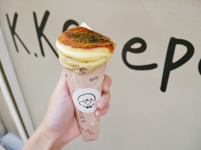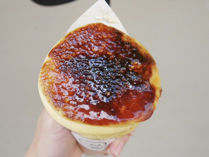 表面をバーナーで炙ることで、ほんのり苦味のあるパリパリのブリュレ層が完成!カリッと香ばしく割れる表面、濃厚で贅沢なクリーム、ベリーの酸味、そしてしっとりもちもちの生地。色々な食感や風味が一度に楽しめる贅沢なクレープでした。