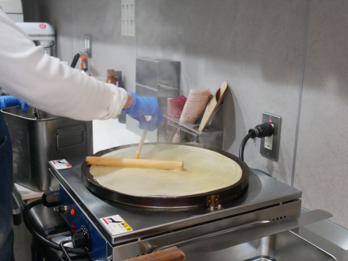 カウンターから店内を覗いてみると、すぐ向こうでスタッフが生地を広げている様子が目に映ります。生地が焼ける音や、ふわりと立ちのぼるバターの香りがたまりません♪