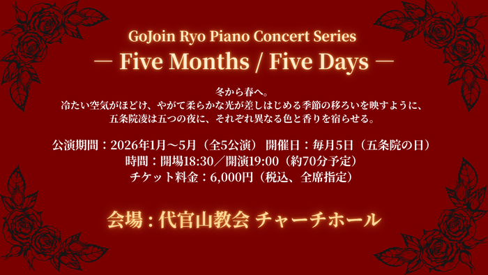 ピアニスト・五条院凌が、自身の象徴的な数字“五”にちなんだ五ヶ月連続の特別公演『GoJoin Ryo Piano Concert Series — Five Months / Five Days —』を2026年1月から5月にかけて、毎月5日に代官山教会チャーチホールにて開催することを発表した。