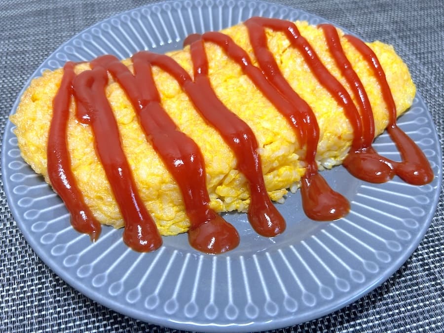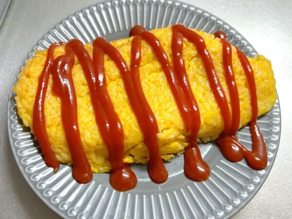 ひっくり返したオムライスを表と同じように焼き固めたら、お皿に移してケチャップを適量かけ、完成。お皿に移すのも、そのまま滑らせるだけ、という簡単さでした。