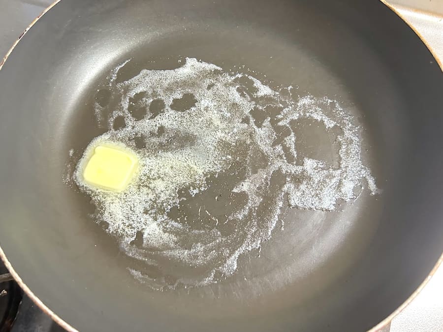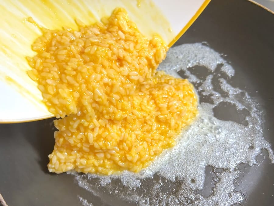 しっかり混ざって卵かけご飯の状態になったら、バターを溶かしたフライパンへ投下。