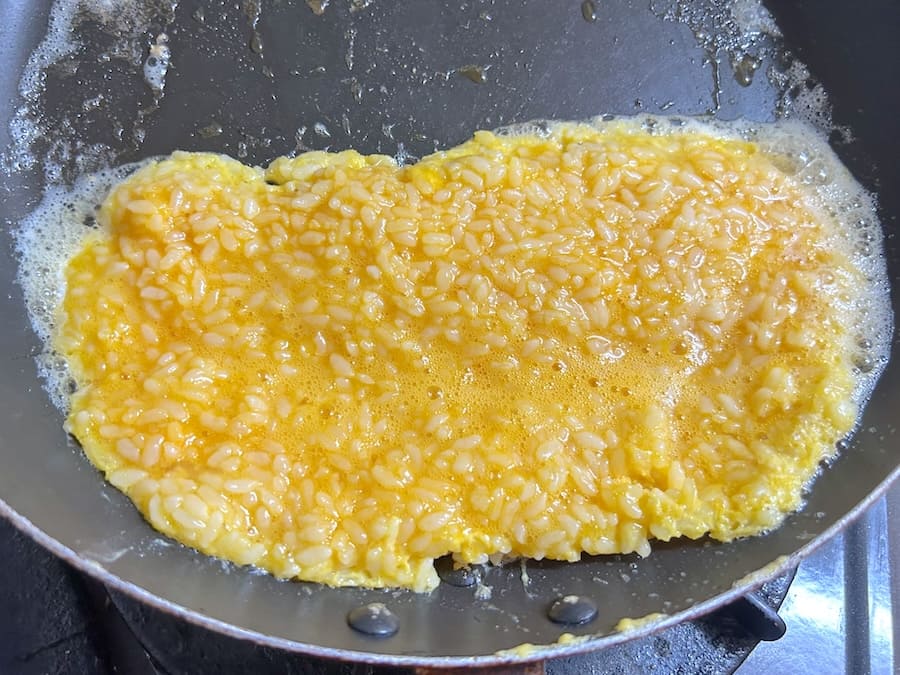 そしてある程度火が通ったところで、フライパンの縁を使ってひっくり返します。ここが「やけくそオムライス」の一番の山場。