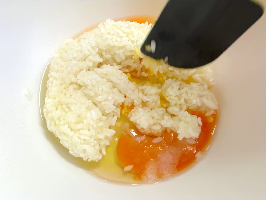 まずはボウルに卵と塩、味の素、ご飯をいれます。このとき、卵は先に溶かず、ごはんと同時に混ぜるのがポイント。リュウジさんは動画内で「ご飯を入れて溶いた方が混ざりやすいからです」と話しています。