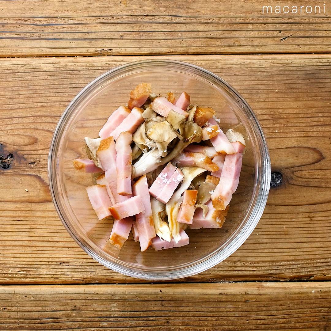 1: 耐熱容器にまいたけ・ベーコン・【調味料】を入れてふんわりラップをかけ、レンジ600Wで2分加熱します。