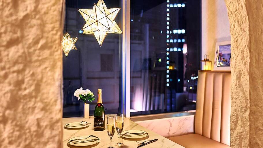 夜景に満たされる空中散歩を楽しんだあとは、ロマンティックな余韻をそのままに、「アニヴェルセルカフェ みなとみらい横浜」でクリスマスディナーを。フランス語で「記念日」を意味する「アニヴェルセル」を店名に冠したカフェレストランで、まさに特別なデートにうってつけ。水辺のロケーションに位置し、夜を迎えるとイルミネーションきらめく夜景が目前に。