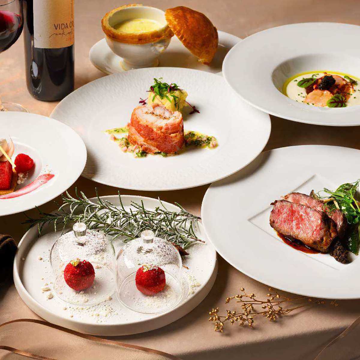 12月20日(土)から25日(木)までは、クリスマスシーズン限定・全6皿のディナーコースを販売。しゅわしゅわの泡が弾けるスパークリングワインで乾杯したら、美しすぎる見た目の「鶏のリエット」が! オーナメントをスノードームで包みこんだかのようなビジュアルに、思わずキュンとしてしまいそう。メインディッシュは、じっくり丁寧に焼き上げた「国産牛ロースのグリエ」。トリュフの香るマデラソースとの相性が素晴らしく、至福のディナータイムに。クリスマスギフトを思わせる特製デザートにもうっとり。