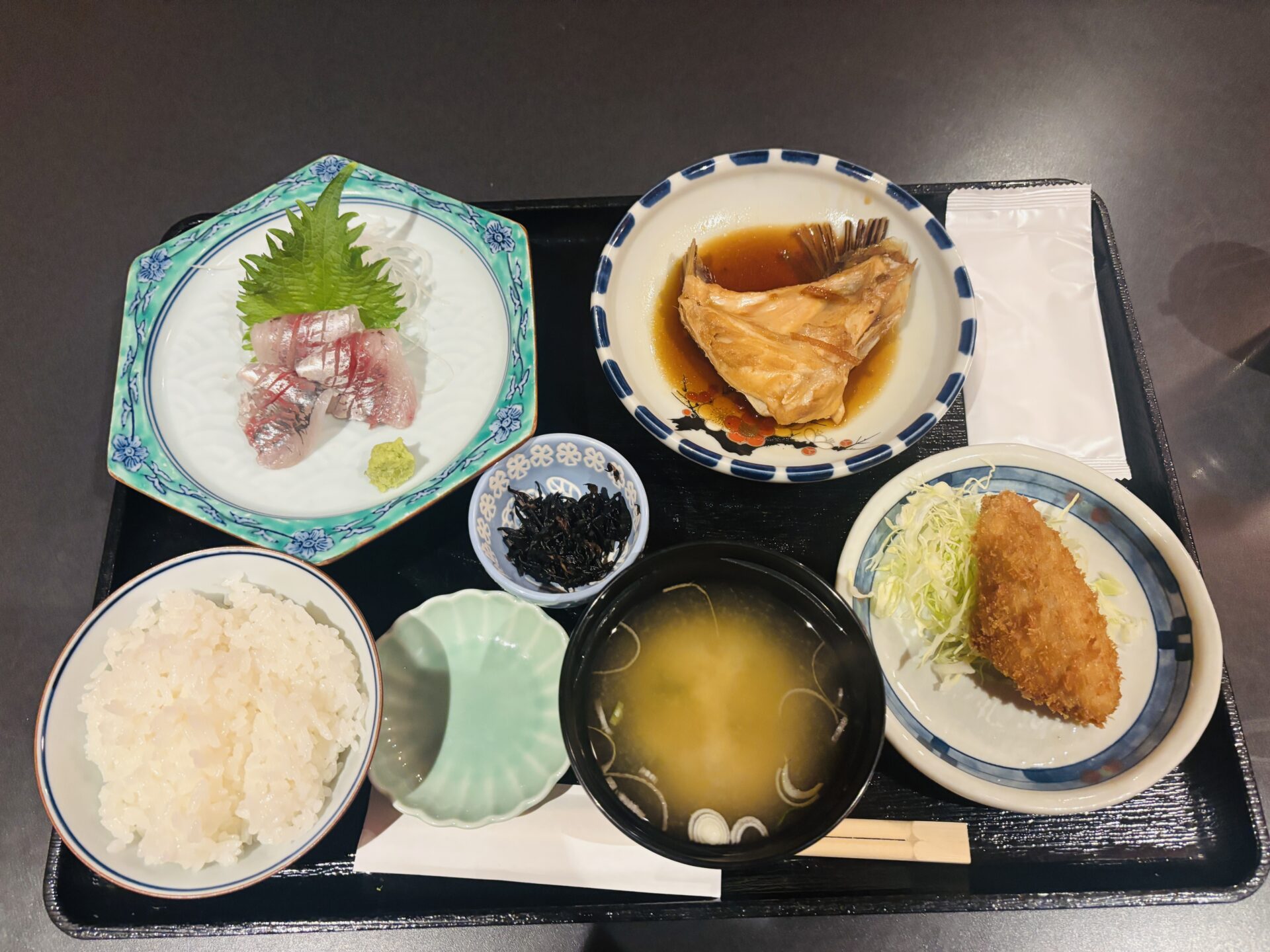 仕入れは相模湾で朝獲れた地魚が中心で、上品に盛られた刺身定食が人気。日替わりで内容が変わる定食は、煮魚・フライ・刺身など季節の味わいをバランスよく堪能できます。