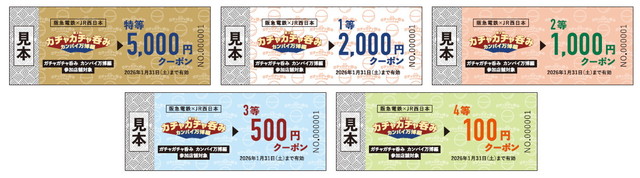 前回のクーポン割引上限は2,000円でしたが、今年度はなんと5,000円に大幅アップ! そしてすべてハズレなし! 特等5,000円、1等2,000円、2等1,000円、3等500円、4等100円のクーポンが当たります。