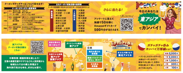 今回の「ガチャガチャ呑み カンパイ万博編」のテーマは“万博”。阪急&JRの各沿線の飲食店のなかでも、日本や東アジア、ヨーロッパといった多彩なジャンルの全48店舗が特典利用の対象店となります。