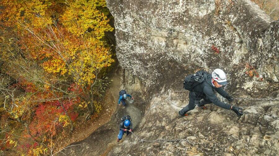 奥紅葉谷で進む紅葉、ロープウェー乗り場も賑わい