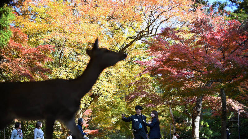 宮島に多く生息する鹿たちも、紅葉の見頃を迎えた園内をゆったりと散策しています。